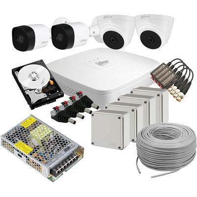 1 x Dahua 4CH 720P DVR H.265 1 x 1TB HDD 2 x Dahua 720P Bullet 2.8mm 20m IR 2 x Dahua 720P Dome 2.8mm 20m IR 1 x Power Supply 10A 12V 1 x Dahua CAT5e 100m Solid Copper 4 x HD Video Balun Pair 4 x DC Jack Plugs 4 x 100x100x50 Junction Boxes