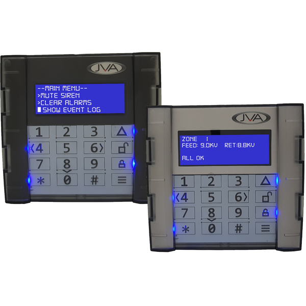 The JVA 4-Line LCD Keypad is an integral component in the JVA Security Electric Fence product range. Providing a centralized interface between the Customer and their Perimeter Security Solution; it displays the current condition of each security device connected and can draw attention to adverse fence conditions.