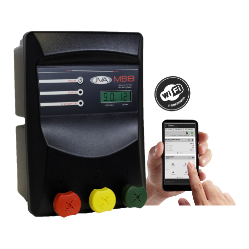 The JVA MB8 Electric Fence IP Energizer® makes animal control a breeze. Its new styling and features include an audible warning if there is a serious fault on the fence and JVA's patented Auto-Sync TradeMark Technology which helps keep your fences safe .